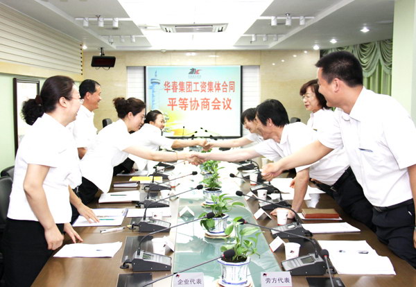 華春投資集團(tuán)企業(yè)方代表與職工方代表在前幾次協(xié)商的基礎(chǔ)上,于6月9日召開了正式的三項(xiàng)集體合同平等協(xié)商會(huì)議。勞資雙方都本著從整體上維護(hù)員工的合法權(quán)益、構(gòu)建和諧的勞資關(guān)系、促進(jìn)企業(yè)生產(chǎn)經(jīng)營秩序良好發(fā)展的原則,嚴(yán)格按照集體合同訂立的程序,就三項(xiàng)集體合同有關(guān)條款內(nèi)容又一次進(jìn)行了全面、仔細(xì)、坦誠、熱烈、深刻的平等協(xié)商對(duì)話,達(dá)成了共識(shí),達(dá)到有利于雙方的預(yù)期,最終擬定了集體合同草案。此次平等協(xié)商會(huì)議由華春投資集團(tuán)工會(huì)主席高青主持。